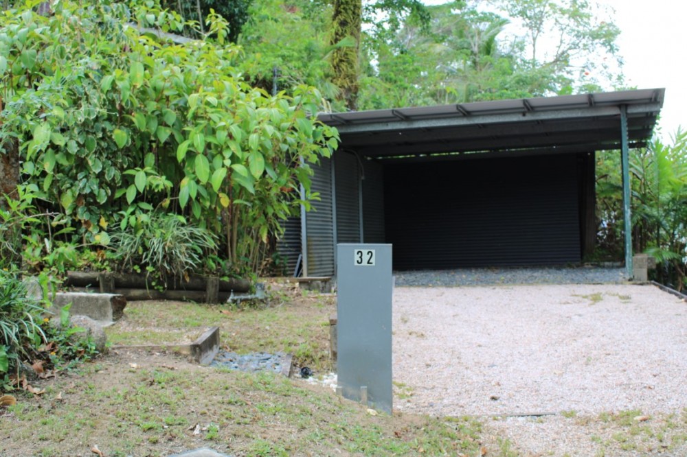 Undercover carport at the entrance. There are tropical gardens that lead into the backyard which is terraced with a garden shed and great views.
