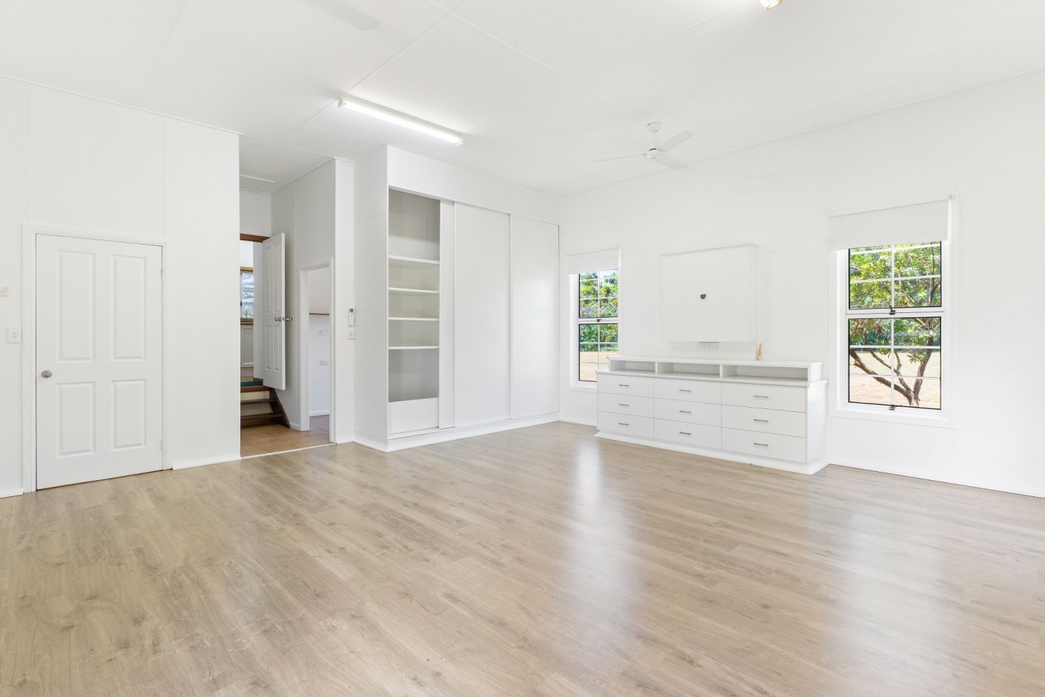 * Downstairs large bedroom or living room ready to be converted into a granny flat or guest accommodation.  This room already has built in storage cupboards, storage room and shelving.