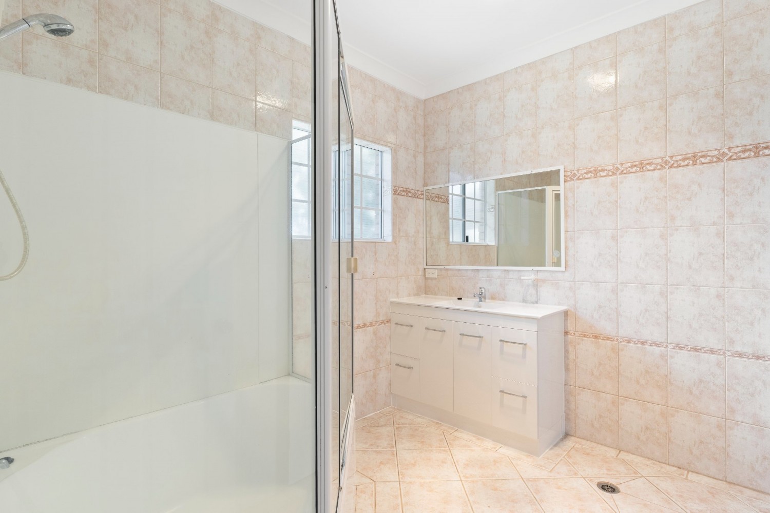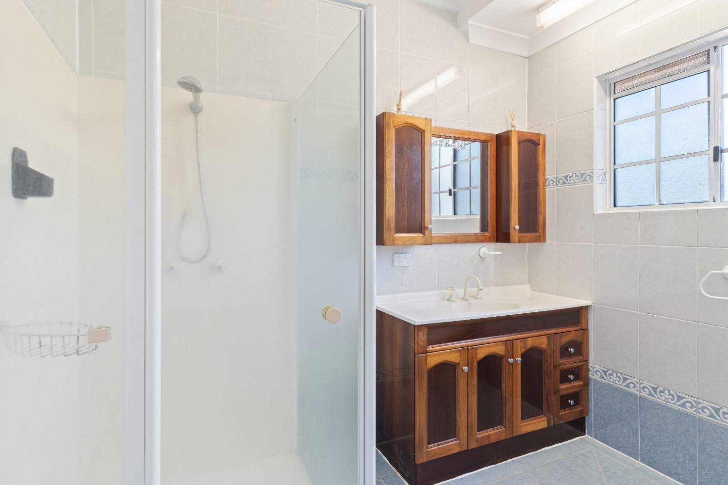 * Main bathroom with shower and bath, vanity and storage cupboard